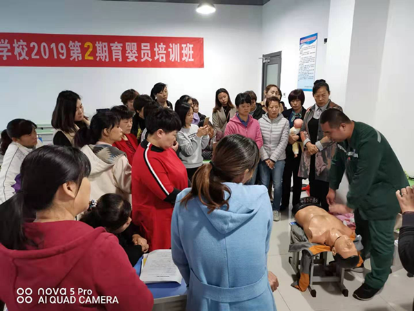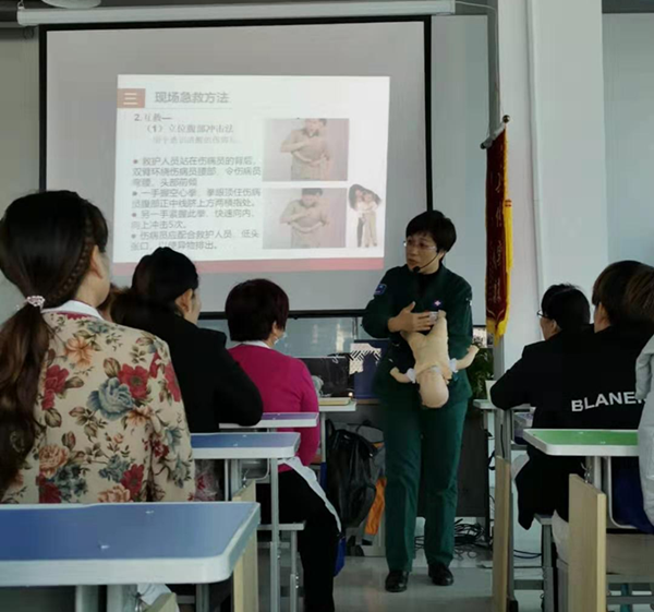 培训课上,急诊科医护人员结合家政学员们的工作特性,运用理论与实操相结合的方式,首先通过PPT向学员们重点讲解了心肺复苏与气管异物的操作要点及过敏、烧烫伤、溺水、触电、外伤时的紧急救护等方面的理论知识。再利用模拟人进行现场模拟救护操作,开展心肺复苏实操演练,以便学员们更好地学习和掌握应急救援救护基础知识和技能。