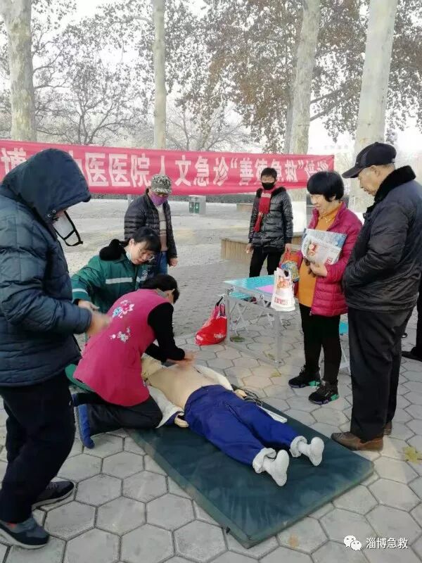 2019年12月7日上午,淄博市中医医院急诊科医务人员利用休息时间在科主任王磊带领下走进大公园,为当地人民群众上了一堂生动的急救知识培训课。此次培训旨在让普通群众识别急救和进行自我急救的能力,让急救意识牢记心中,让急救技能深入基层。